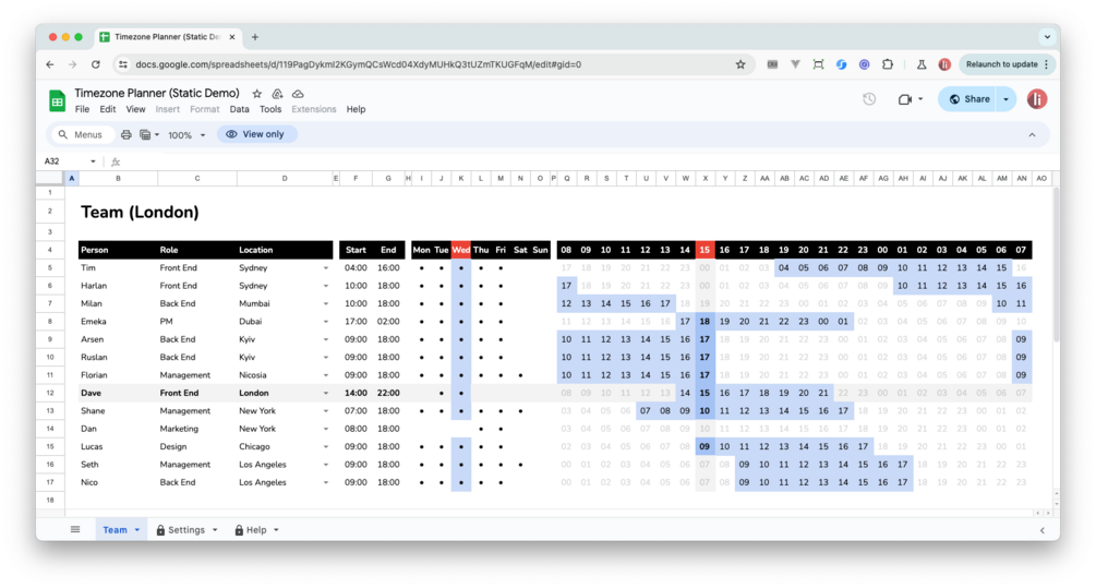 The real magic is the sheet's advanced formulas, timezone calculations, and conditional formatting which transparently factor in location, timezone offsets, local time, available days, working times, overnight hours, even daylight saving time calculations, then rebuilds the sheet in relation to the team member's current timezone (it even updates every minute!).